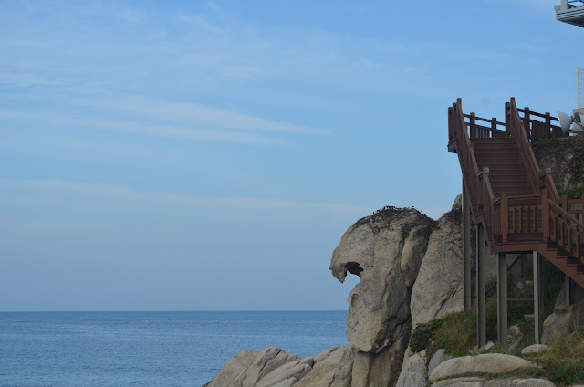 На самом въезде в город расположен красивый парк Daewangam (N 35º29.481' E 129º26.255'). С видовой площадки парка открывается великолепный вид на город. А если спуститься к морю, то можно погулять по подвесным мостикам, построенным на скалах.